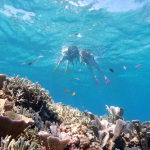 浅瀬に広がる珊瑚とルリスズメダイ!